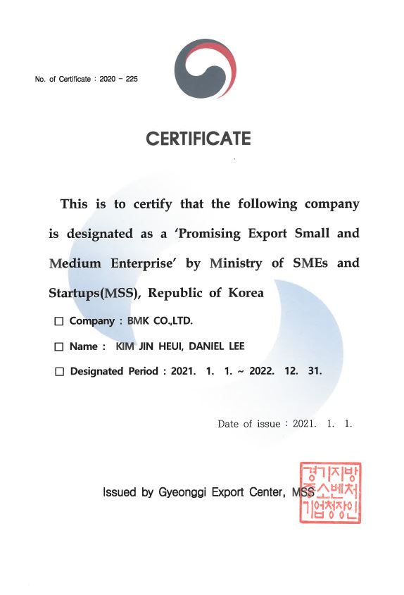Promising Export Small and Medium Enterprise 페이지 정보 작성자 비엠케이 작성일21-01-22 10:56 조회3,277회 관련링크 이전글 다음글 목록 본문 'Promising Export Small and Medium Enterprise' by Ministry of SMEs and Startups(MSS), Republic of Korea 이전글 다음글 목록
